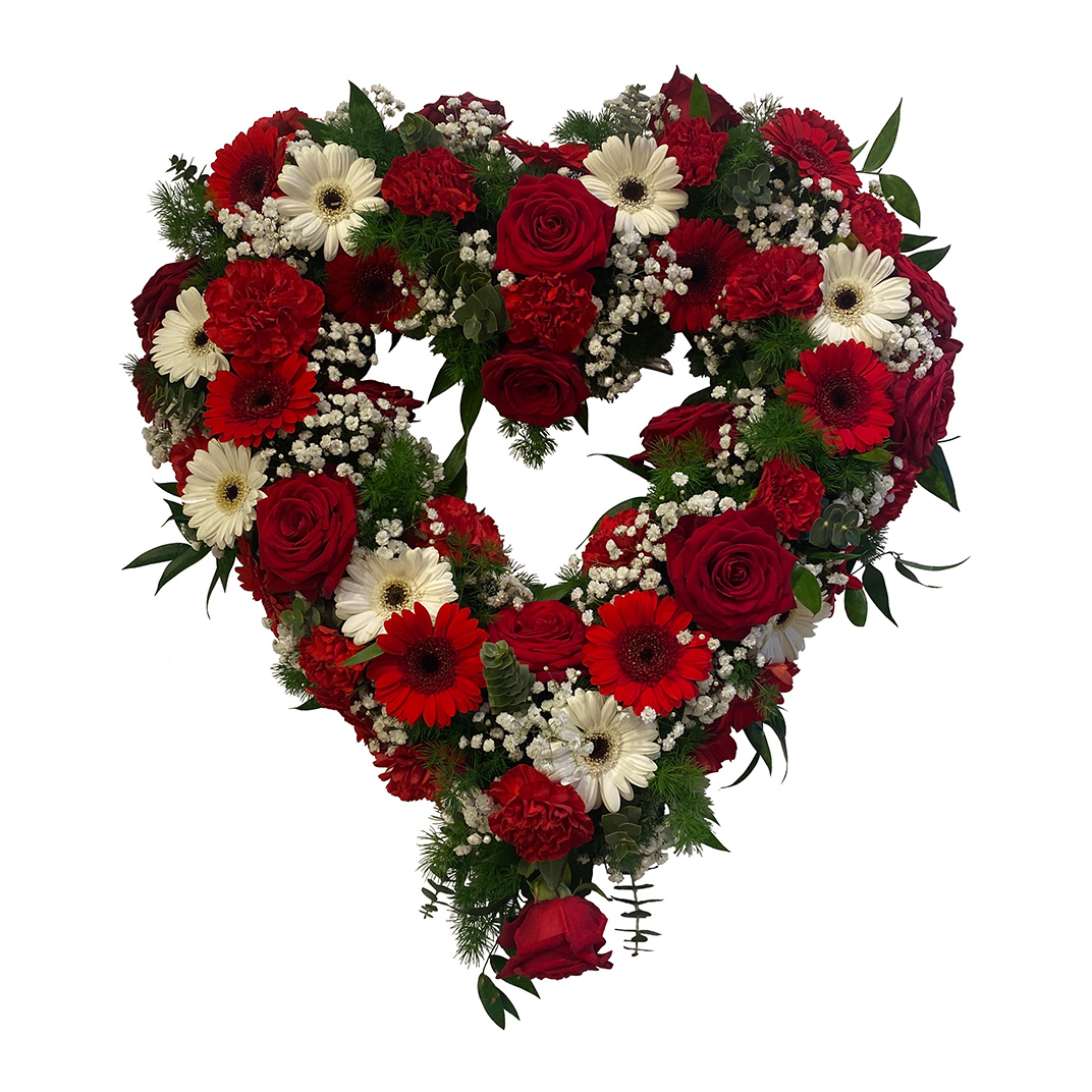 Onze zeer ervaren rouwbloemisten stellen dit handgebonden mooie open rouwhart voorzien van rode rozen, witte gerbera’s, rode chrysanten en gipskruid met de grootste zorg voor je samen. Wij werken alleen met dagverse bloemen en bladgroen. Bestel dit mooie rouwhart eenvoudig via onze website. Wij bezorgen jouw rouwhart op tijd en op elk adres in Nederland. TOP rouwstuk is sinds 1994 gespecialiseerd in bijzondere rouwharten.