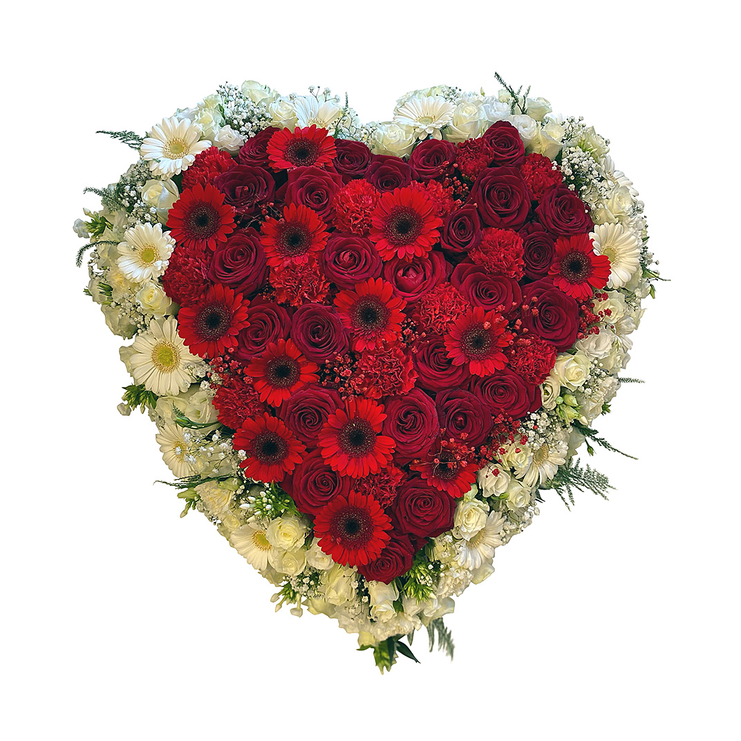 Onze ervaren uitvaartbloemisten stellen dit handgebonden rouwhart voorzien van witte en rode bloemen met de grootste zorg voor je samen. Wij werken alleen met dagverse bloemen en bladgroen. Bestel dit prachtige rouwhart eenvoudig via onze website. Wij bezorgen jouw rouwhart op tijd en op elk adres in Nederland. TOP rouwstuk is sinds 1994 gespecialiseerd in bijzondere rouwharten.